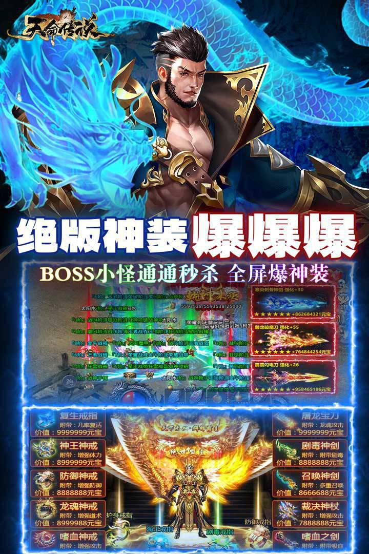 天命在我,传说永恒! 《天命传说》是一款经典武侠传奇打金手游,上线即可免费领满VIP,首冲免费送,打怪就能爆真充,不肝不氪,散人也能玩转传奇。 完美还原的经典武侠世界,快意恩仇的热血江湖,在收集武林绝学和打怪爆金中体验刀刀暴击,拳拳到肉的真实体验。当经典武侠与创新传奇玩法的完美结合,降龙十八掌对上九阴真经,究竟孰强孰弱,更多精彩玩法,都等待您的探索!